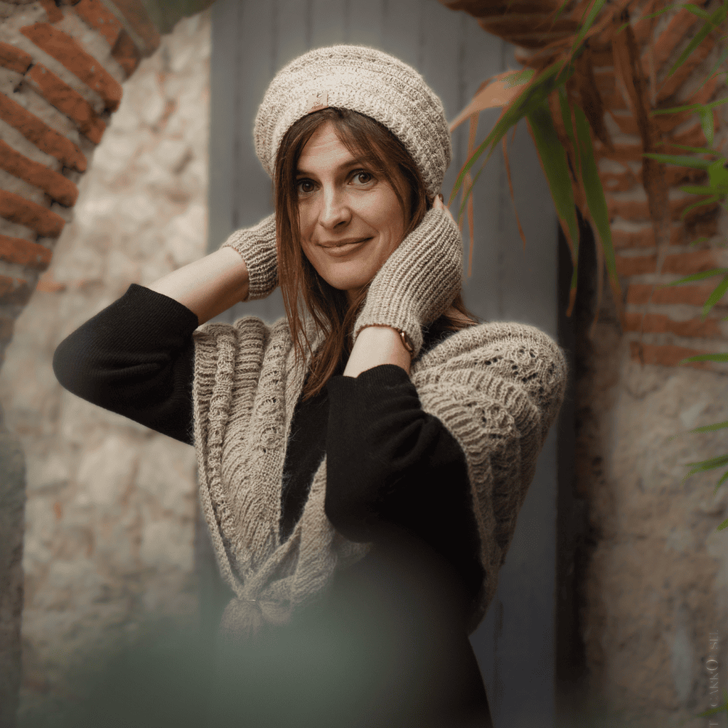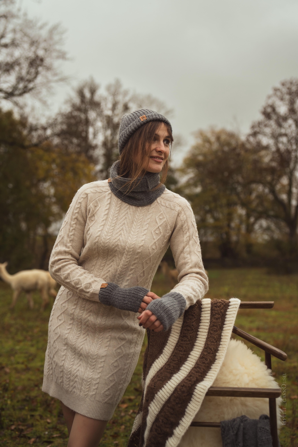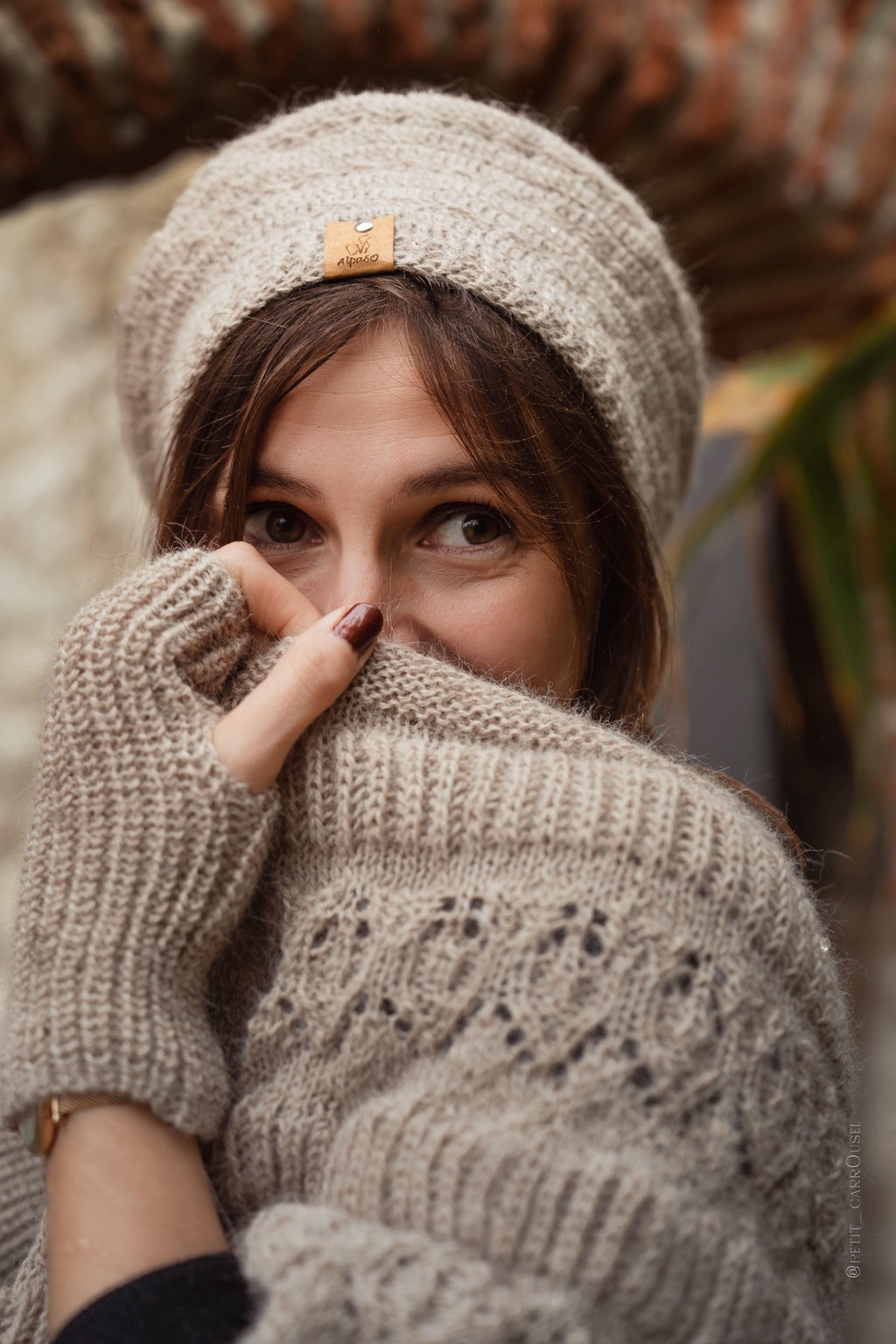 Tricoté avec notre précieuse laine d'alpaga, dans un point réversible dense et souple.